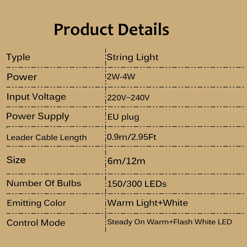 Son alimentation en 220V garantit une consommation d'énergie optimale, vous permettant de profiter d’une lumière éclatante sans vous soucier de votre facture d'électricité. De plus, grâce à sa facilité d'installation, vous pourrez l'accrocher où bon vous semble : sur un mur, autour d'une fenêtre, ou même suspendue entre des arbres dans votre jardin.
