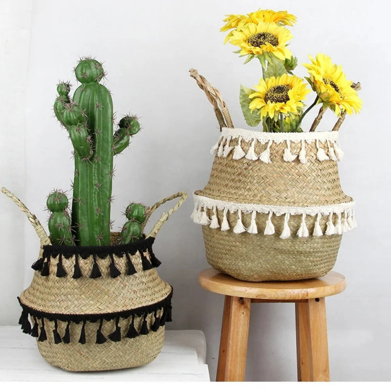 Imaginez un salon où ces paniers s'alignent en harmonie avec des coussins colorés et des tapis en jute, ou une chambre où ils servent à ranger des couvertures et des livres, tout en ajoutant un accent boho élégant. Leur polyvalence vous permet de les utiliser comme pots de fleurs pour vos plantes d'intérieur, apportant ainsi une touche naturelle à votre décoration tout en optimisant l'espace.